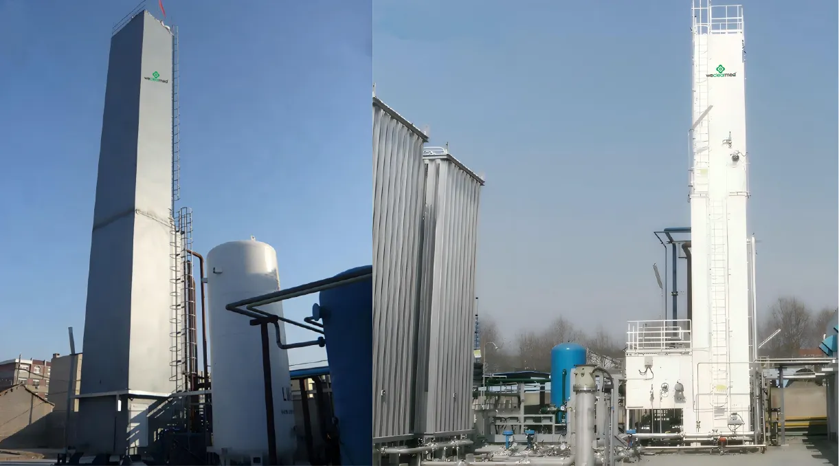 3. Luchtscheiding: in een destillatiekolom worden het stijgende gas en de stroomafwaartse vloeistof onderworpen aan warmte- en massaoverdracht op een plaat of verpakking; Het stikstofgehalte van het stijgende gas neemt toe, terwijl het zuurstofgehalte van de stroomafwaartse vloeistof toeneemt.